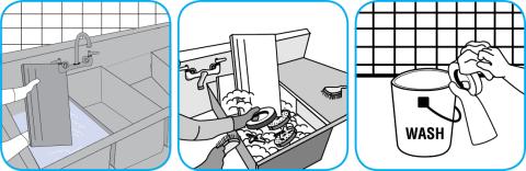 Diluya con agua caliente. Deje las ollas, cacerolas, utensilios, cristalería y otros equipos en remojo durante 5 a 10 minutos. Restriegue para eliminar la grasa y otros residuos de comidas. Enjuague bien a fondo con agua potable.